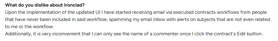Plus, a few users have mentioned how implementing the updated UI complaints about poor search functionality. Users report receiving emails via contract workflows from people who’ve never been included in the workflow.