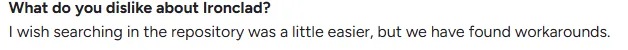 After a steep learning curve, poor search functionality is the second-most disliked feature of Ironclad, with 9 users in G2 sharing it.