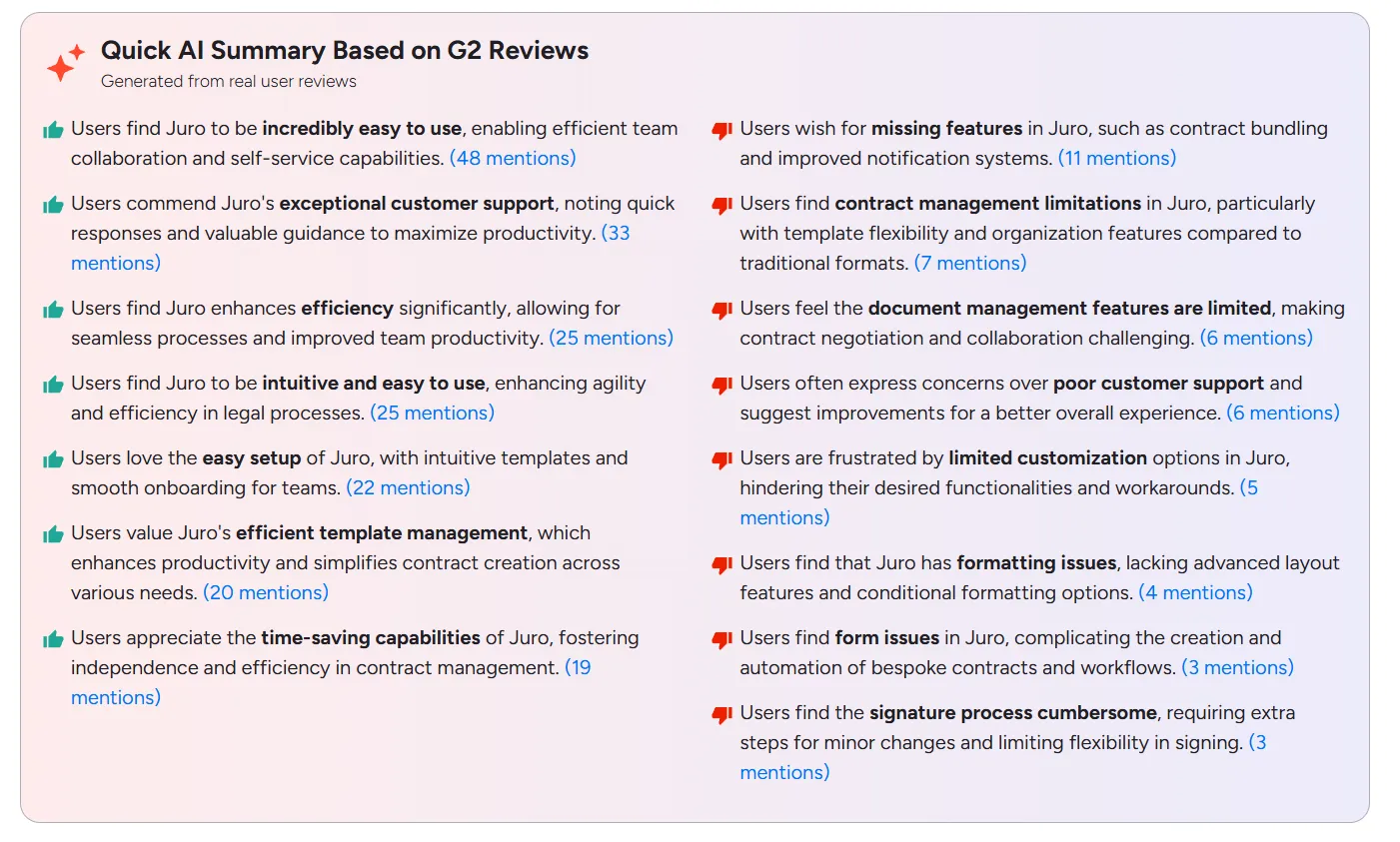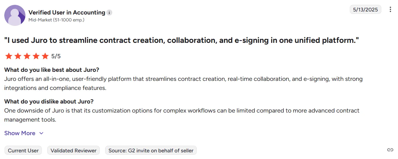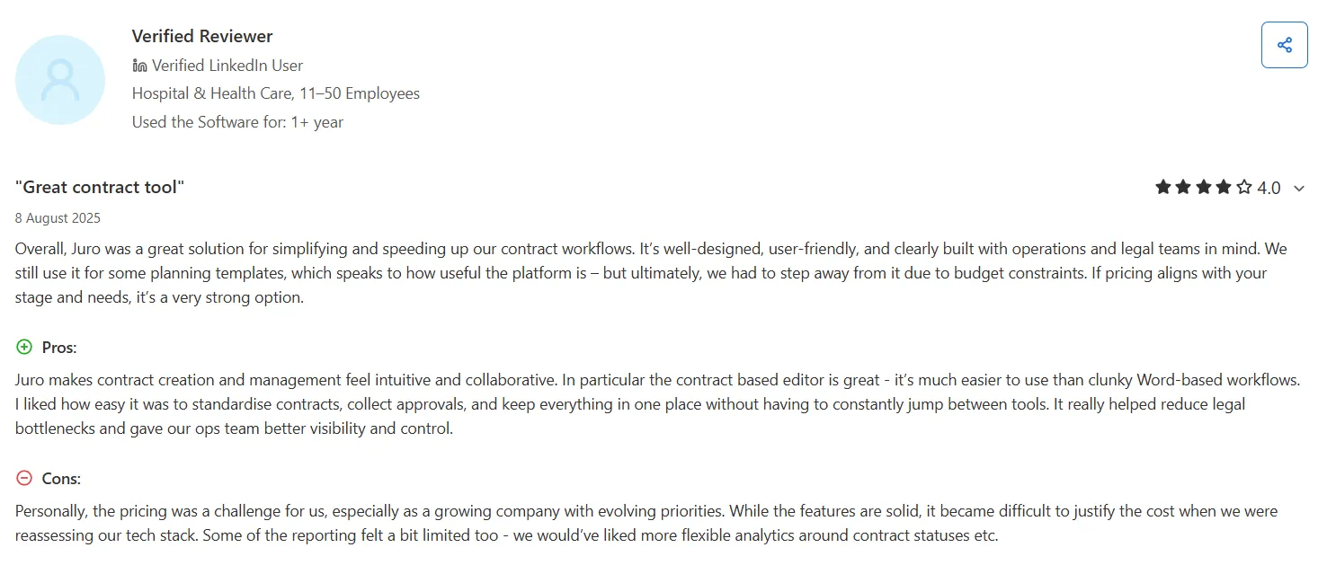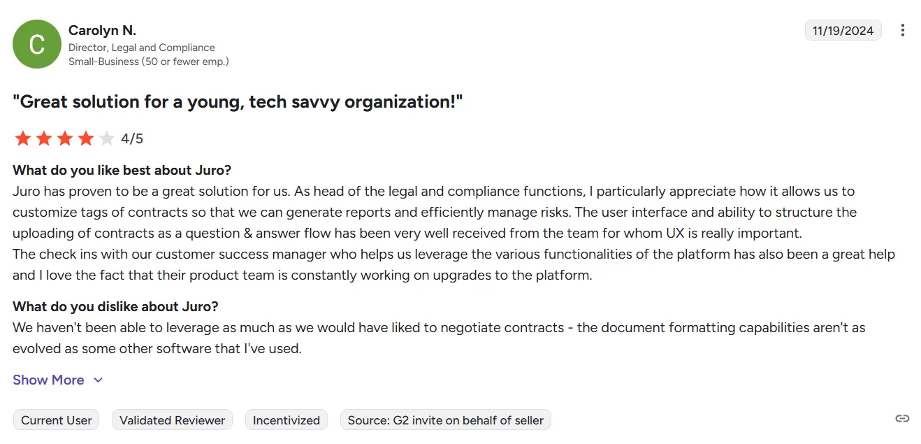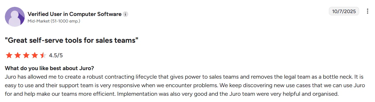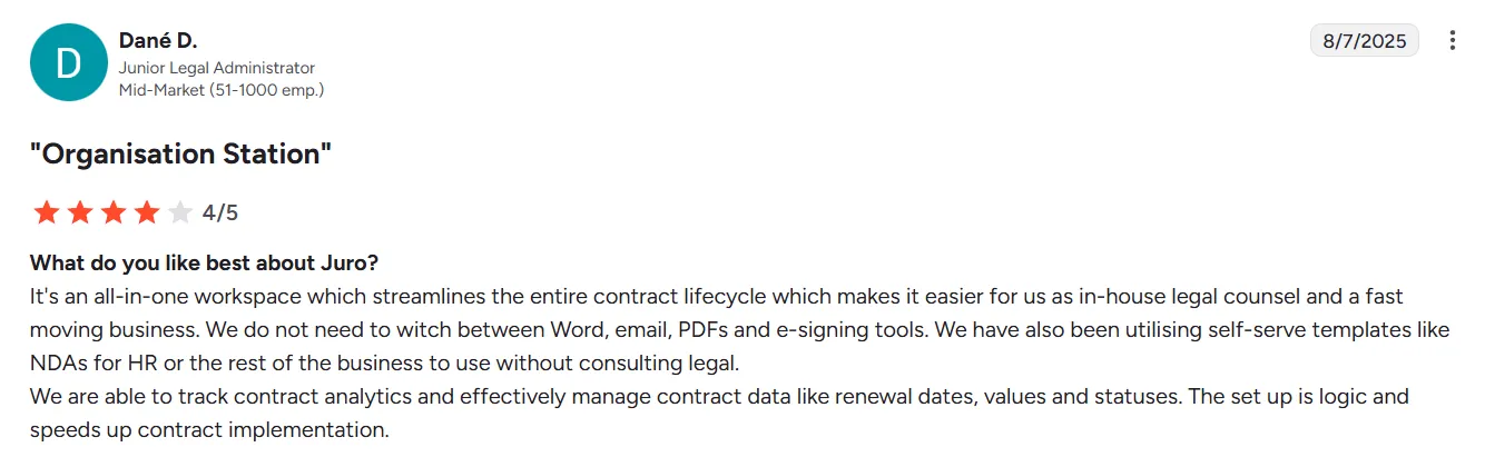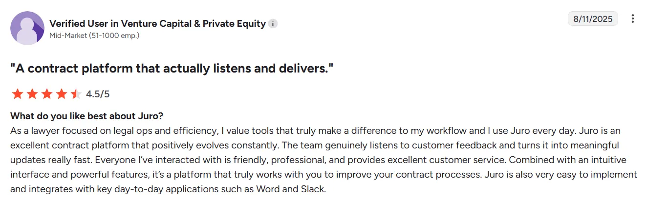 Based on verified Juro reviews from G2 and Capterra, here's what users consistently highlight about the platform.