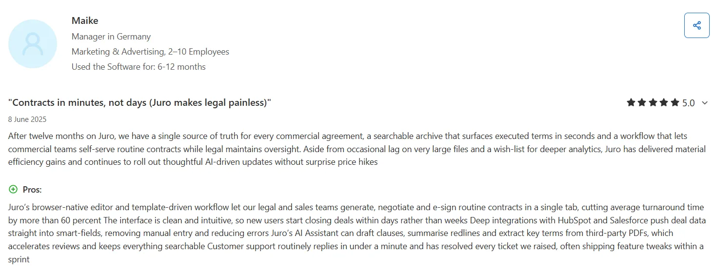 Juro's ease of use is a frequently mentioned positive. Users highlight that the platform enables efficient team collaboration and allows non-legal teams to self-serve on contracts without hand-holding.