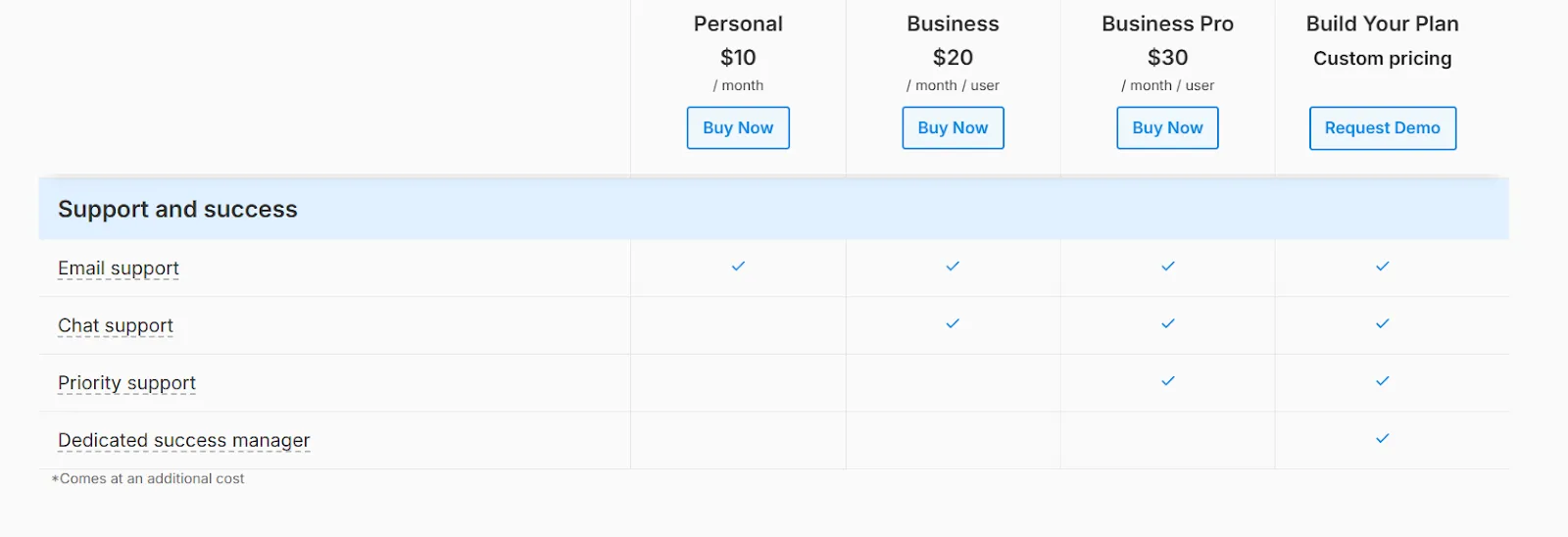 The Personal plan starts at $10/month, Business at $20/seat/month, and Business Pro at $30/seat/month on annual billing.Â