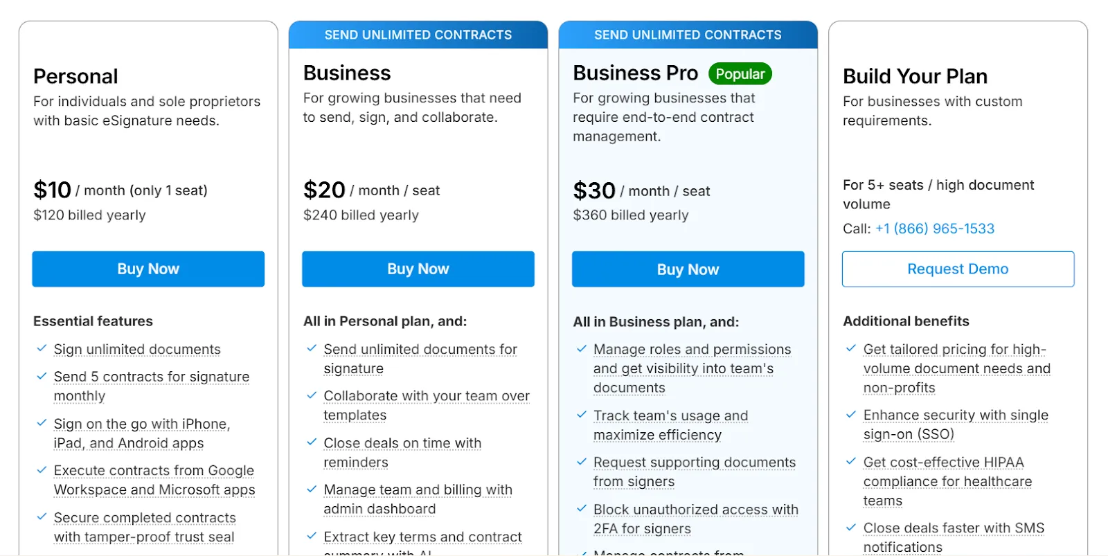 - Transparent pricing from day one: Signeasy publishes clear pricing on its website, starting at $10/month for Personal and scaling to $30/user/month for Business Pro.