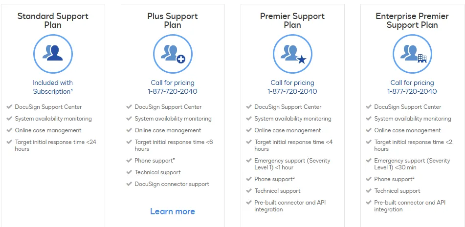 Support options: DocuSign includes standard support with all plans. However, if you require dedicated integration support, phone assistance, or technical guidance, you'll need to purchase an upgraded support plan.