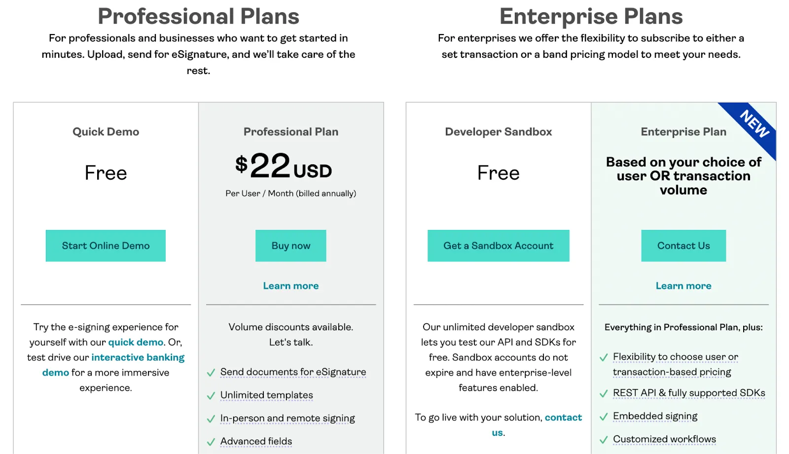 - OneSpan offers a free plan, a Professional plan at $22/user/month for individuals and small teams, a Developer Sandbox (free) for API/SDK testing, and a fully-custom Enterprise plan.