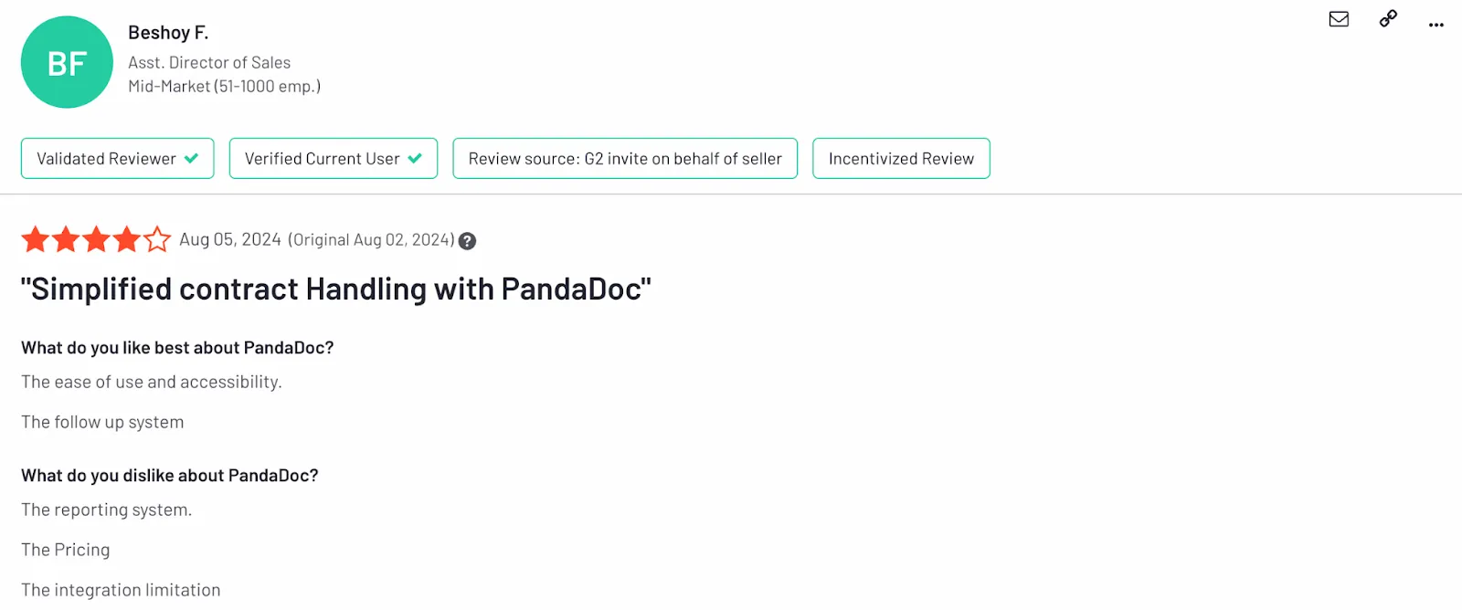 On the positive side, users appreciate the ease of use and the flexibility of PandaDoc, especially for handling contracts and documents. However, pricing is a recurring concern for many reviewers.