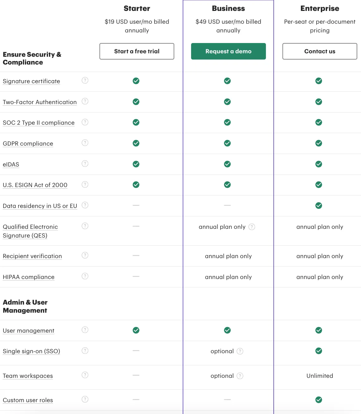 - Annual Plan Exclusives: Important compliance features like HIPAA compliance, Qualified Electronic Signatures (QES), and recipient verification are only available to annual subscribers in the Business and Enterprise plans.