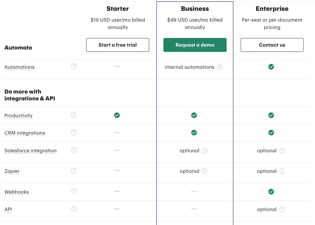- PandaDoc is ideal for businesses that need robust document management, advanced workflows, and integrations with CRMs like Salesforce or HubSpot. However, these advanced features come at a higher cost and often require the Business or Enterprise plan.