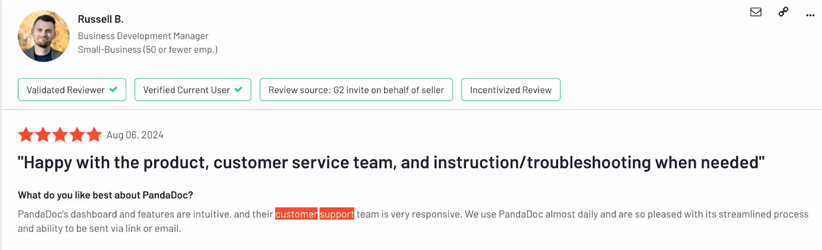 PandaDoc’s customer support receives mixed reviews from users. On one hand, many customers appreciate the responsiveness and helpfulness of the support team. For example, one reviewer expressed satisfaction, noting that PandaDoc’s customer service team is responsive and helpful when troubleshooting issues, making the product easier to use on a daily basis.