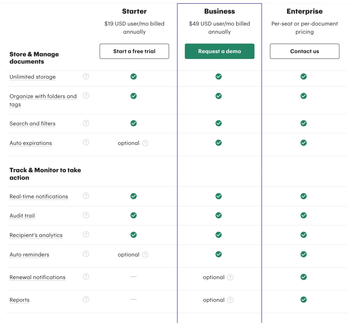While unlimited storage is available across all plans, features like auto-expirations, which are important for ensuring contracts don’t remain open indefinitely, are optional in the Business plan.