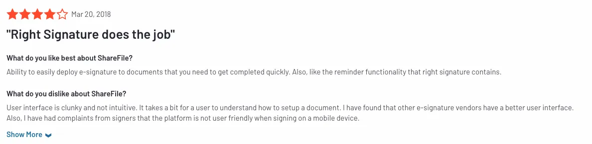 - RightSignature’s eSignature capabilities are embedded within ShareFile, not standalone. This means users pay extra for file storage and collaboration features they might not need.
