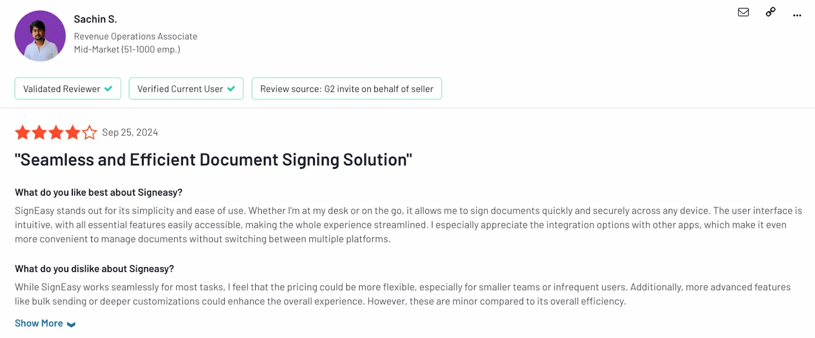 - Limited Advanced Features: Some users note that Signeasy lacks certain advanced functionalities compared to competitors like Docusign.