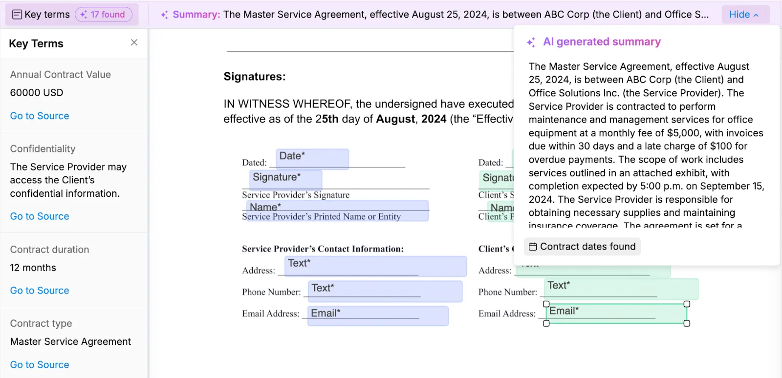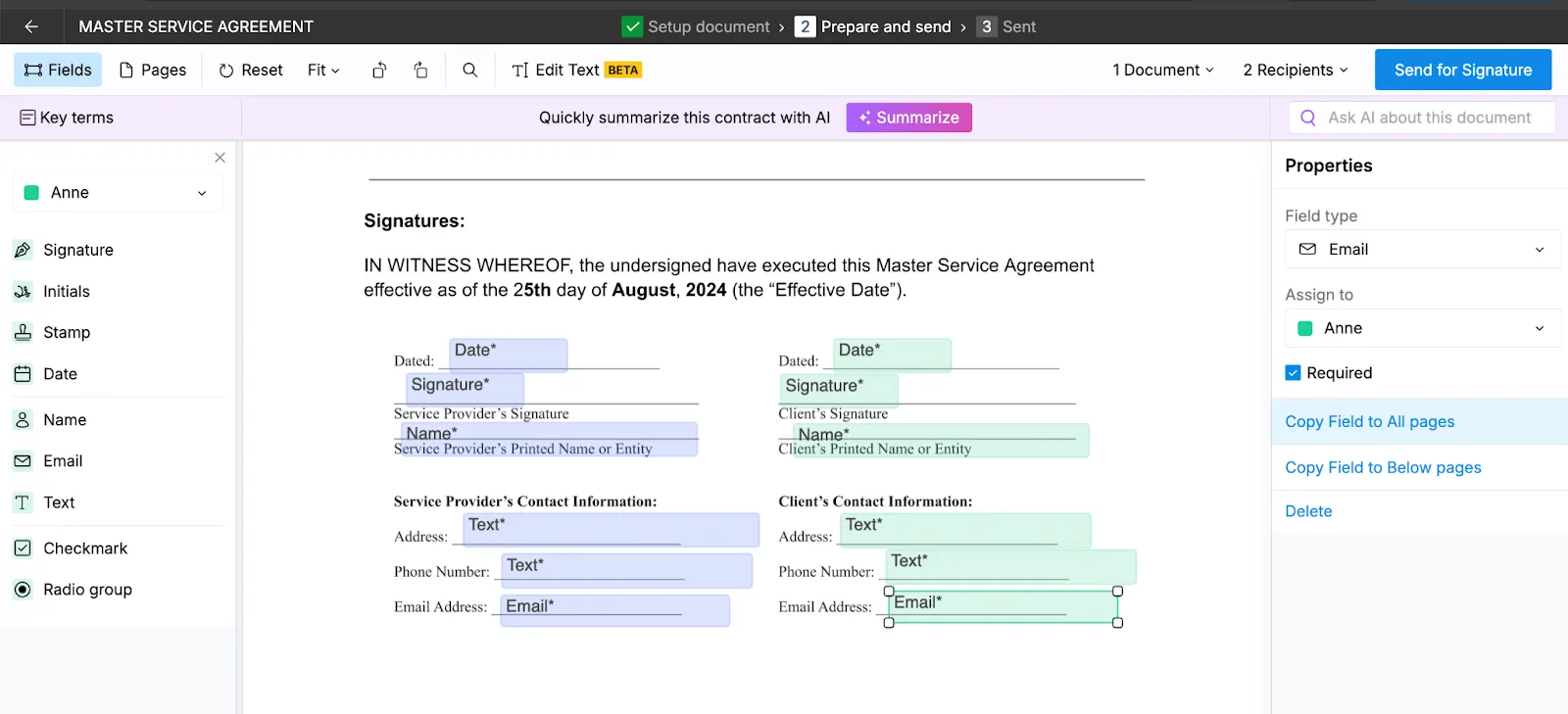 - Customize Signature Fields: Clearly define all required fields such as signatures, initials, dates, and any additional inputs. For multi-page contracts, use features like automatic field identification to avoid missing key pages.