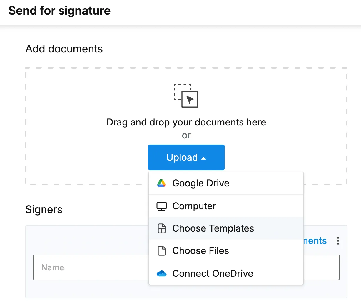 Start by uploading your document. With Signeasy, you can either upload a file from your device, use pre-built templates, import documents from integrated tools like Google Drive or Dropbox, or work directly with originals.