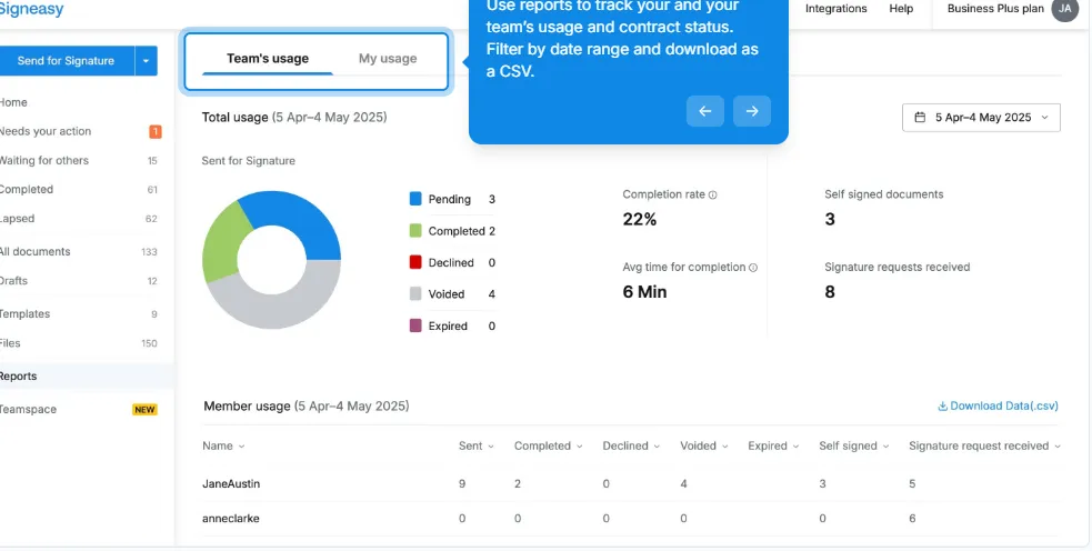 - Cross-departmental document collaboration: We offer shared templates, admin controls, reminders, and approval workflows to make it easier for finance, sales, and HR to work together.