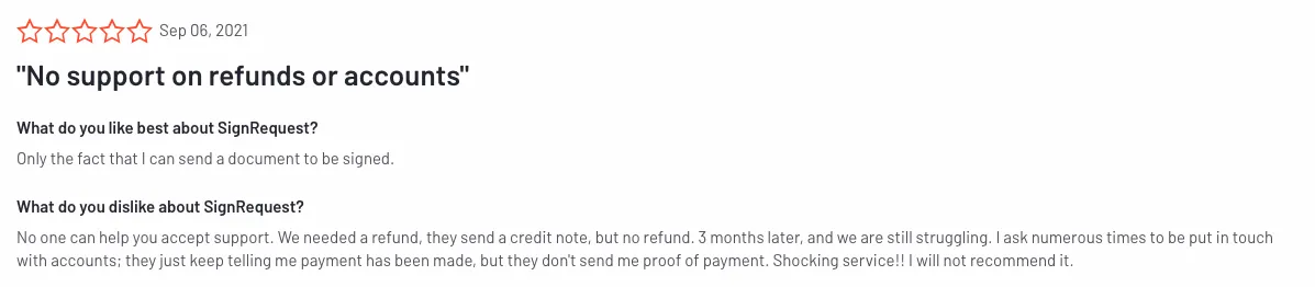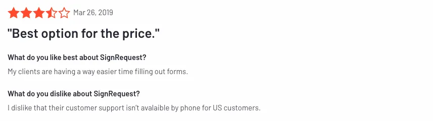Some reviews indicate that users are frustrated with the geographical limitations of SignRequest’s support. Specifically, US customers have noted the absence of a phone support option.