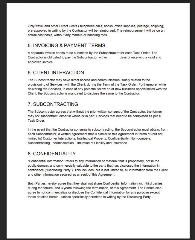 - Pricing and payment terms: Specifies cost structure, billing schedules, invoicing requirements, and payment timelines.