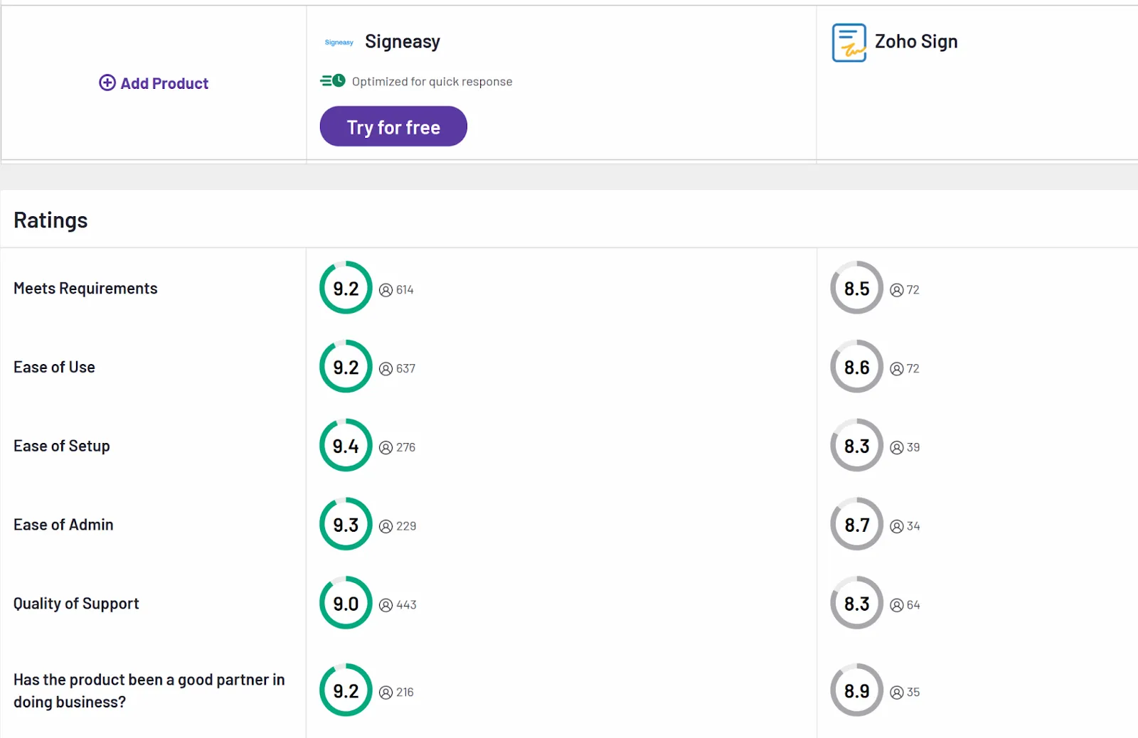 Signeasy receives higher marks for customer support (9.0) versus Zoho Sign’s 8.3. Users appreciate Signeasy’s quick and helpful responses, highlighting a better support experience overall.