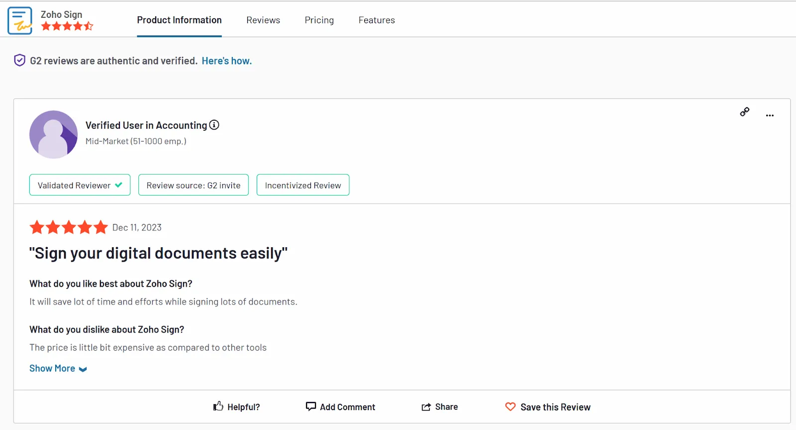 A review from a mid-market accounting company points out that Zoho Sign is often seen as more expensive compared to other eSignature tools. Some users also express dissatisfaction with the per-request API pricing model, finding it less favorable.