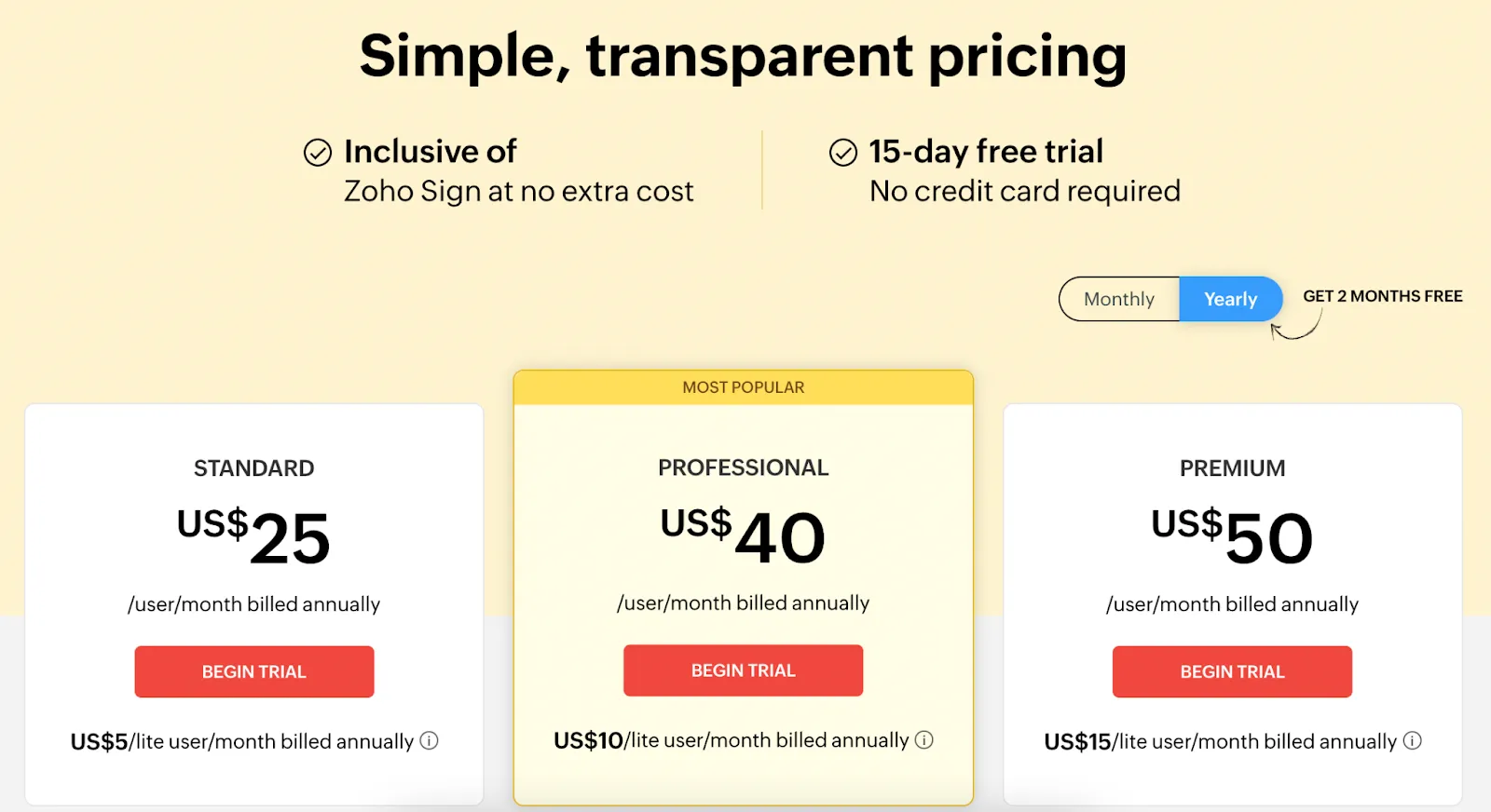 - Features: Includes everything in the free plan with approver actions, SMS signer authentication, integrations with Zoho Apps and third-party apps, and priority technical support.