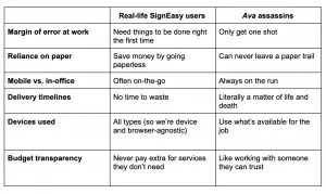 Nevertheless, we couldn’t help but notice certain parallels between the typical Signeasy user and the cutthroat assassins in Ava … so we decided to organize our thoughts.
