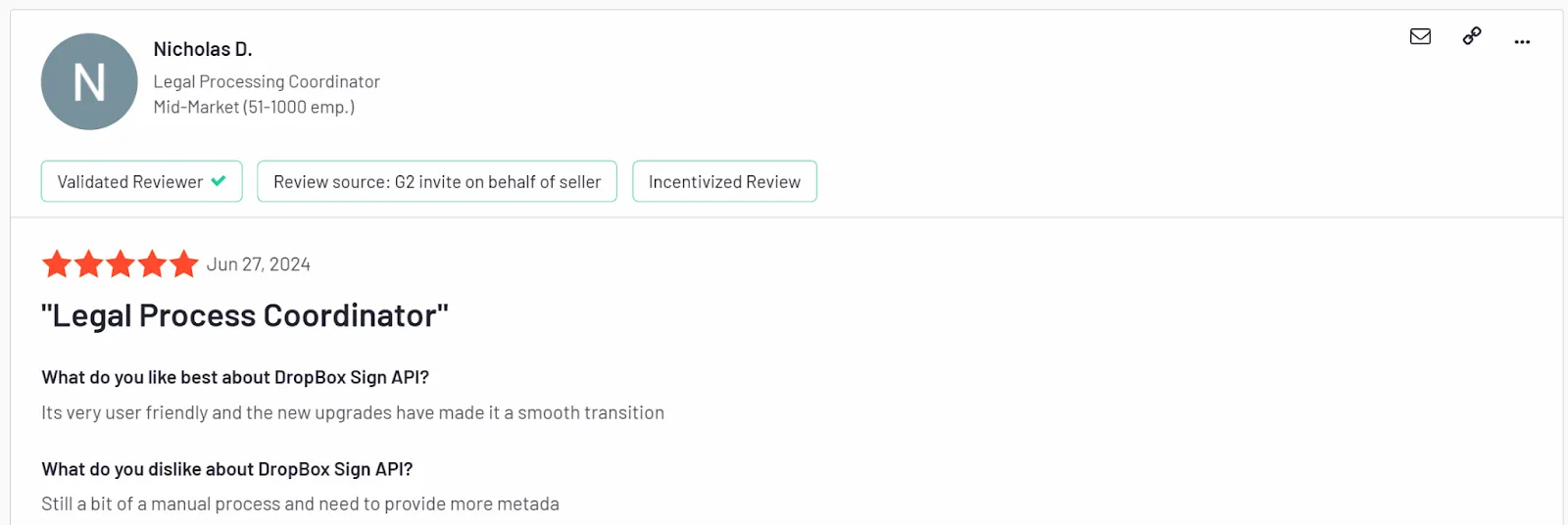 The Dropbox Sign API easily integrates into existing systems to help businesses automate eSigning of documents. It offers a fully branded and secure experience with reusable templates and data encryption. The API is recognized for its flexibility and robust security with tamper-proofing and audit trails to ensure a reliable signing experience.