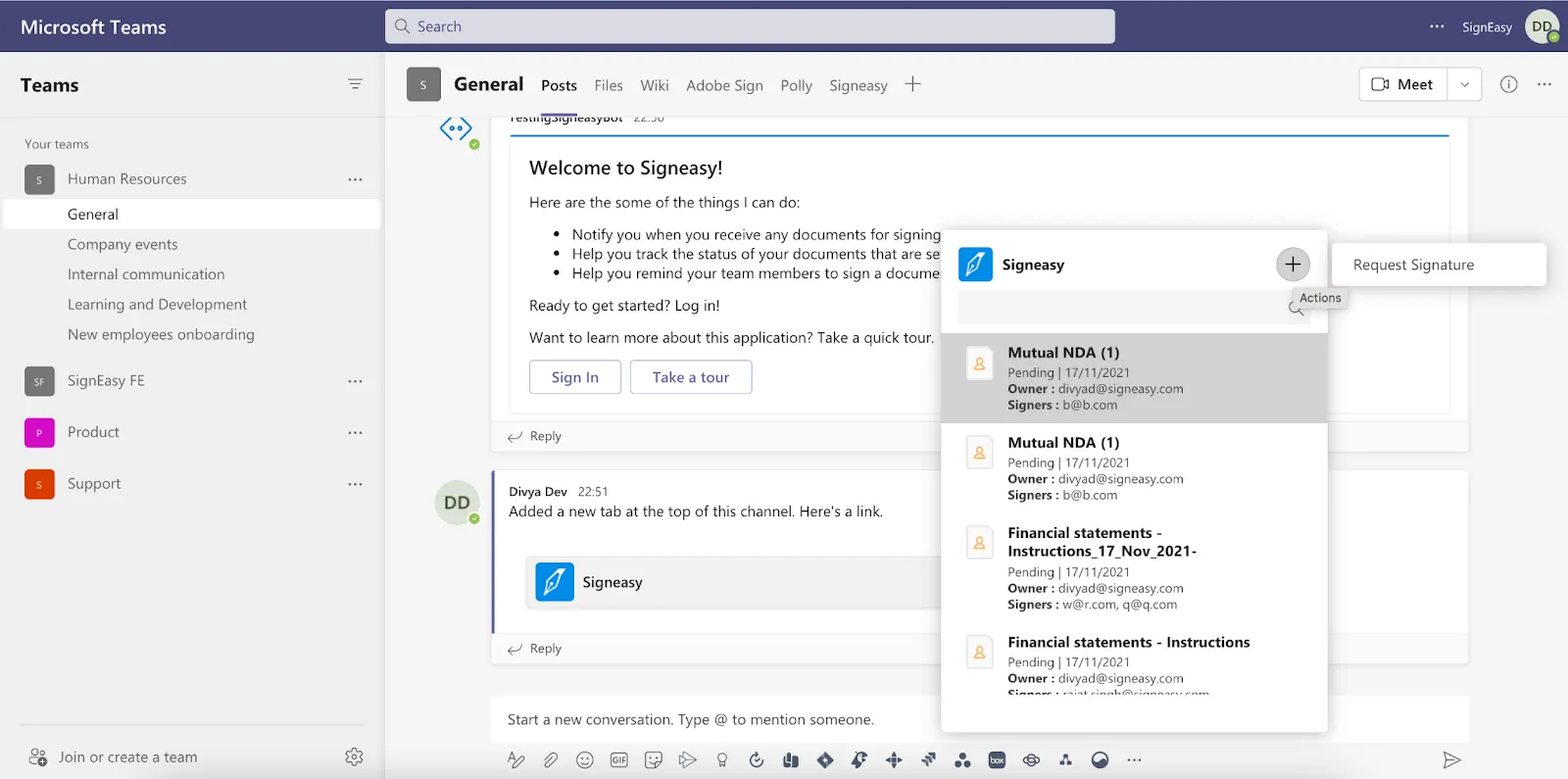 Technically, Microsoft Teams is known for its multiple points of extensibility. Today, Signeasy will be seen in the following extensibility points.