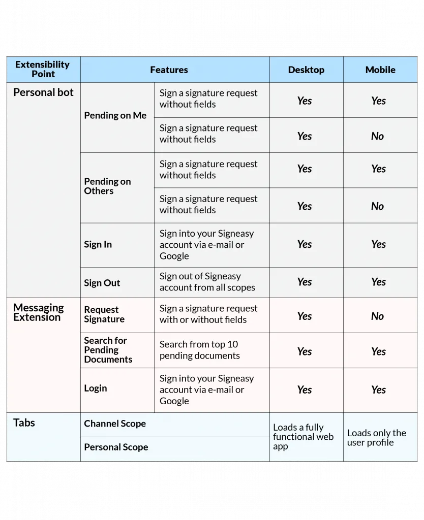 The following capabilities are supported by Signeasy for Microsoft Teams Version 2.0.