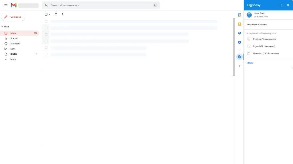 When you launch the Google Workspace Add-on within Gmail or Drive, you will see a summary of your account, the documents, and the subscription plan you are currently on. This helps you get a quick snapshot of how many documents have been signed, how many are pending, and how many documents are backed up in your Drive.