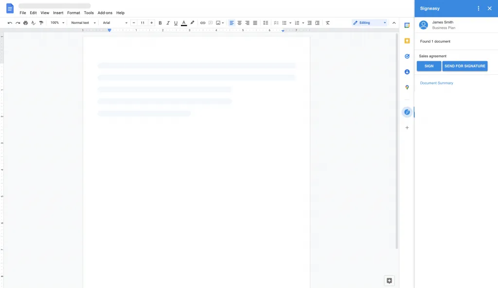 - Select the Signeasy Add-on on the right-hand sidebar, and select the ’Send for Signature’ option.