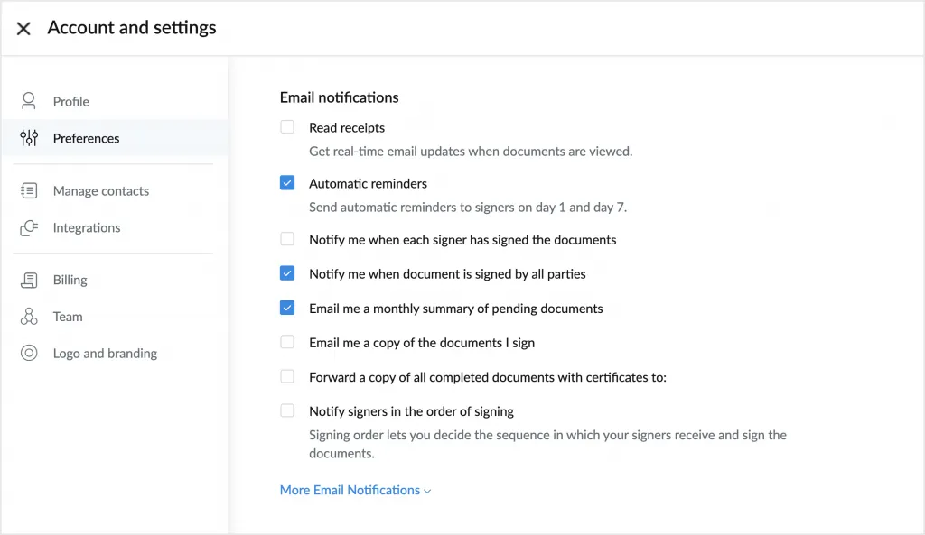 Read Receipts give you real-time email updates when your signers view the document. This context helps you personalize your follow-ups and make the right move. Read Receipts are available on the Business and Business Pro plans. They are turned OFF by default, and you may turn them ON from your account settings whenever you’re ready to use this helpful feature.