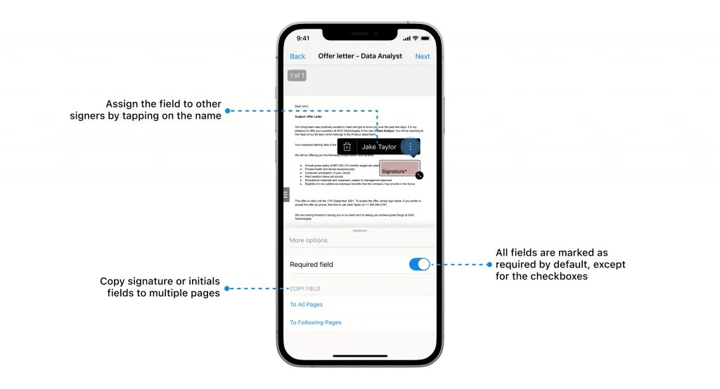 That’s where adding and assigning “fields” comes in. As a sender, you can place a field (signature, date, text, etc.) on the document and assign it to a signer. This will indicate exactly where they need to fill something in, and what type of information is required. The Signeasy web application has had this feature for the last couple of years, and we wanted our mobile users to enjoy the same level of convenience.