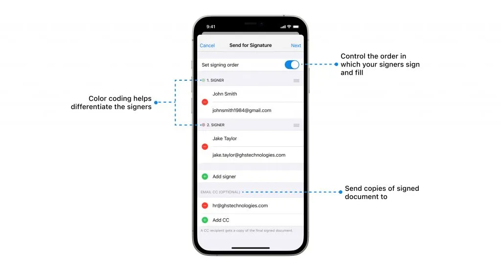 - Color coding is applied to differentiate the signers in the next step, in addition to a name tag, for a totally intuitive experience.