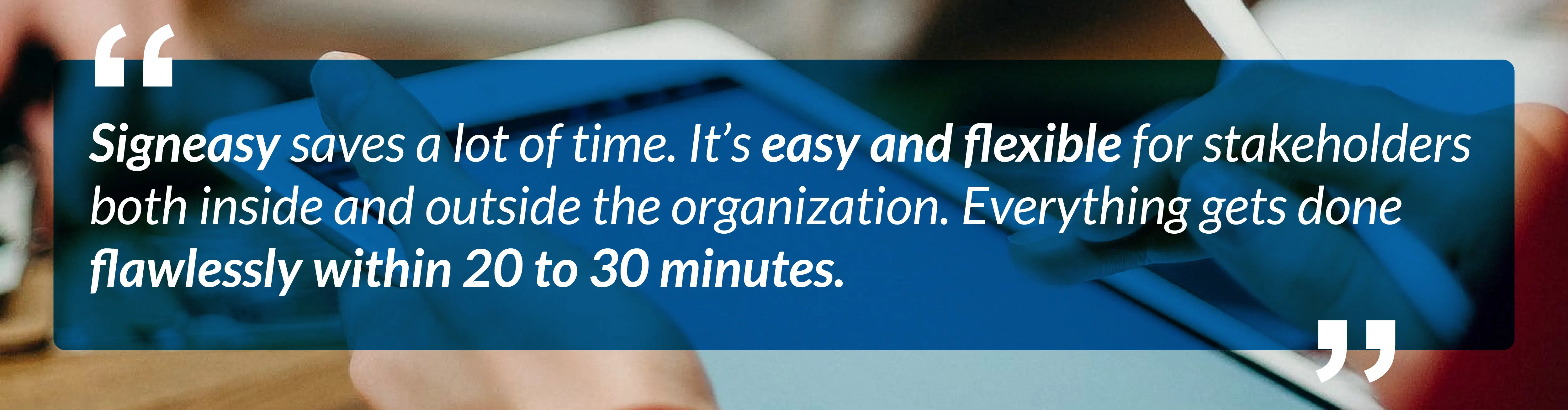 “Signeasy saves a lot of time. It’s easy and flexible for stakeholders both inside and outside the organization. Everything gets done flawlessly within 20 to 30 minutes.”