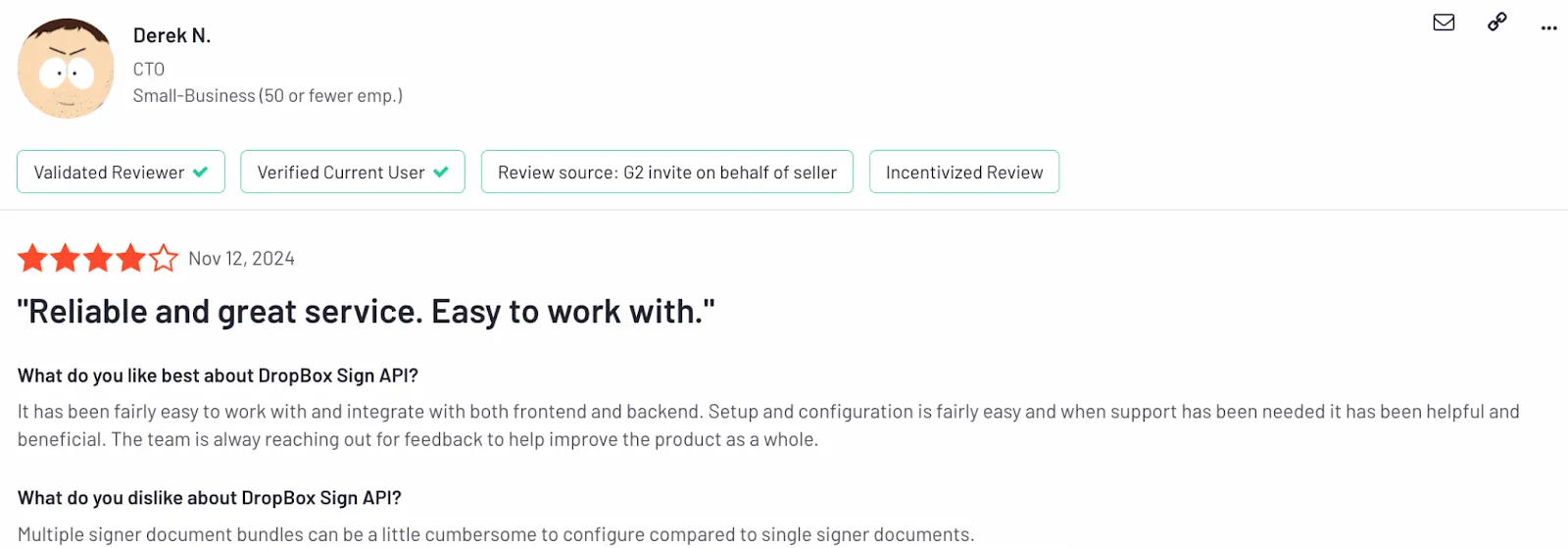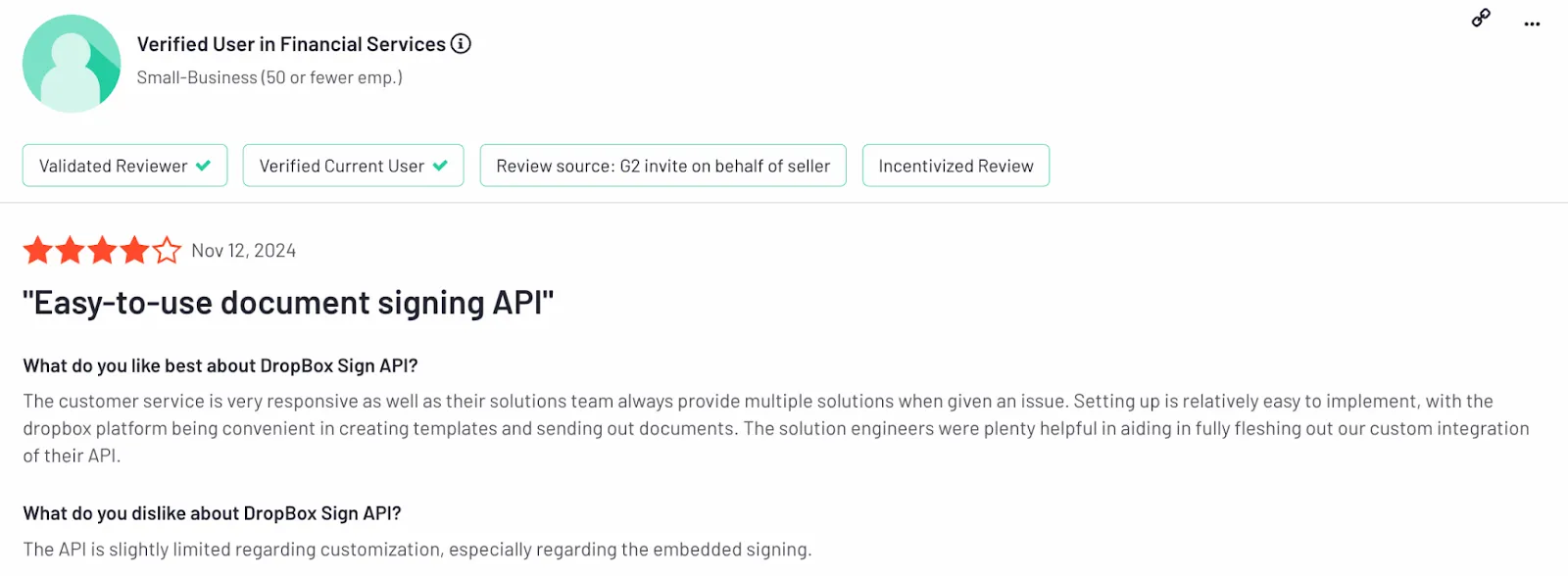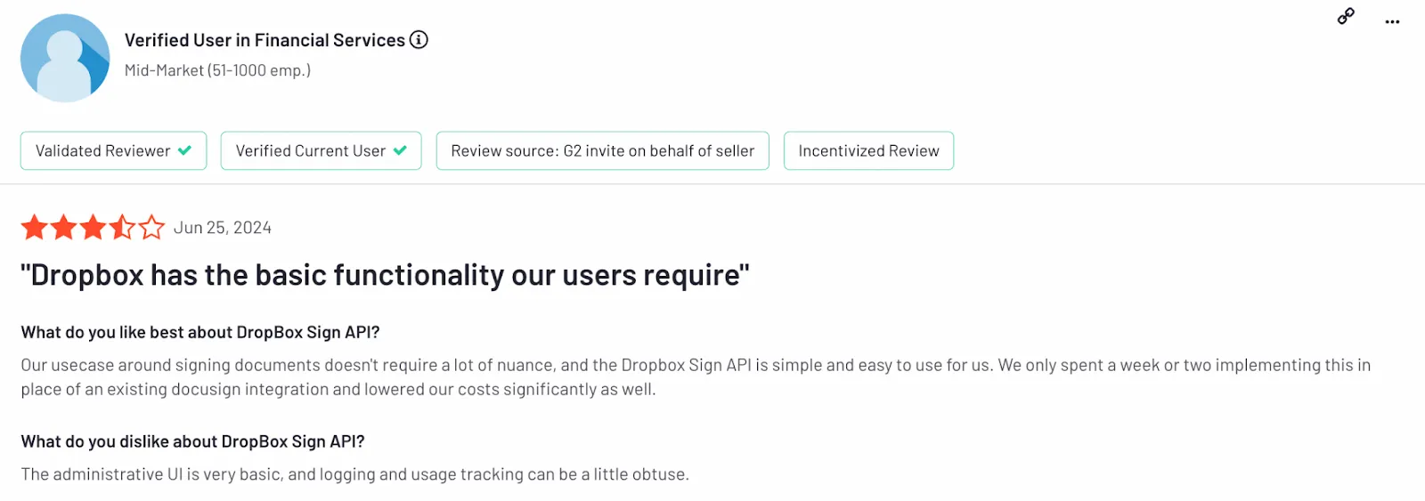 Many users appreciate the simplicity and efficiency of Dropbox Sign API. Reviews highlight its intuitive interface and ability to streamline document signing workflows.