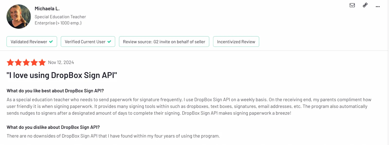 For example, a special education teacher noted how user-friendly the API is for sending and receiving signed documents, particularly for non-technical recipients like parents. The automated reminders for incomplete signatures were also seen as a significant time-saver.