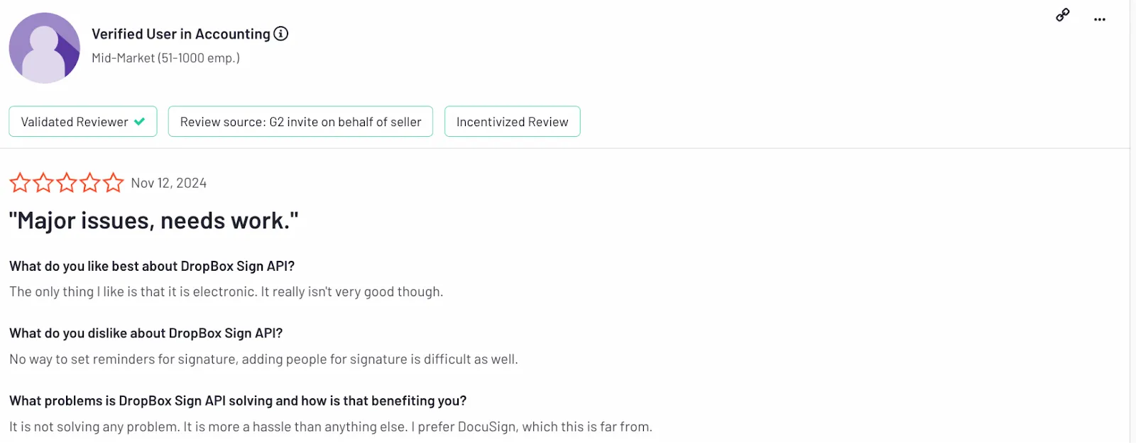 Despite its strengths, some users highlighted areas for improvement. A few users felt the API lacked flexibility in customization, particularly around embedded signing workflows. One reviewer mentioned that managing multiple signer document bundles was cumbersome compared to single signer processes.