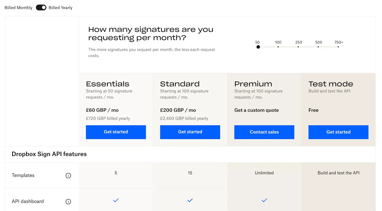 Dropbox Sign API offers flexible pricing to accommodate different business needs and signature volumes. Here’s how the plans stack up: