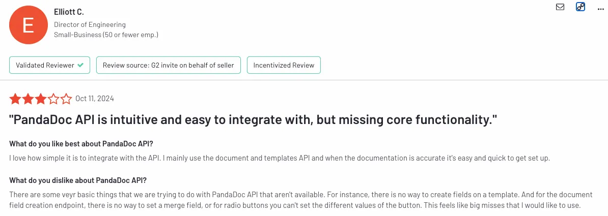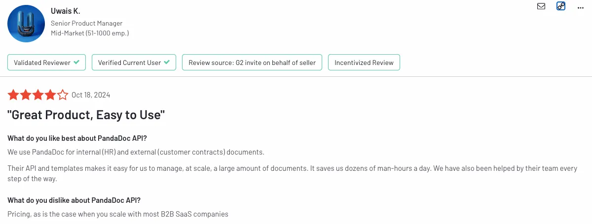 According to user feedback on G2 (a platform that reviews software), it’s evident that a majority of users find the PandaDoc eSign API easy to use. Users also found it to be intuitive and loved how easily they could integrate it.