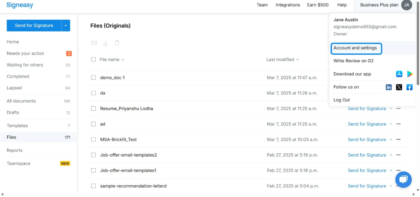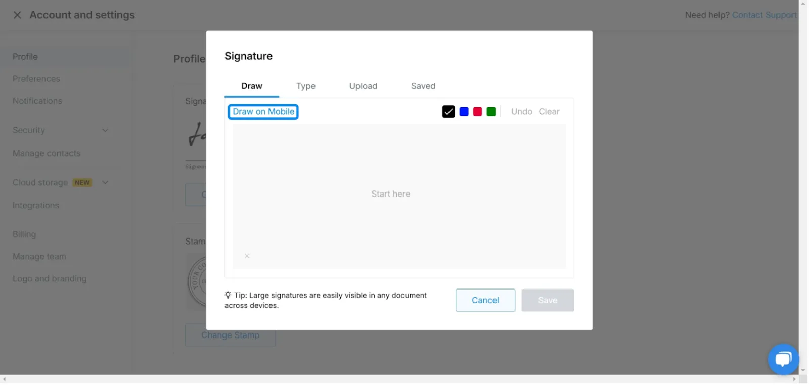 9. Select **'Draw on Mobile'**, and a link will be sent to the email associated with your Signeasy account. Open the link from your email and draw your signature on your mobile device. Your signature will be automatically uploaded to the web app.