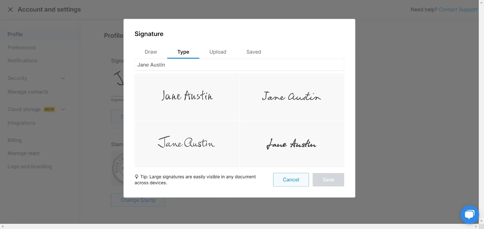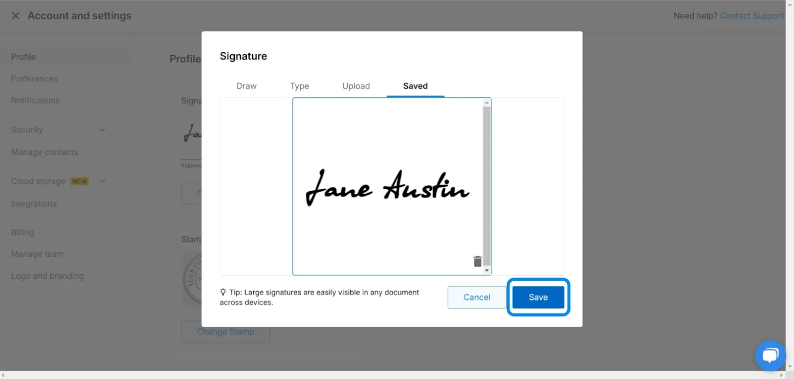 15. Once you've created your signature, it will appear in the '**Saved**' tab. Select the **'Saved'** tab from the signature format options.