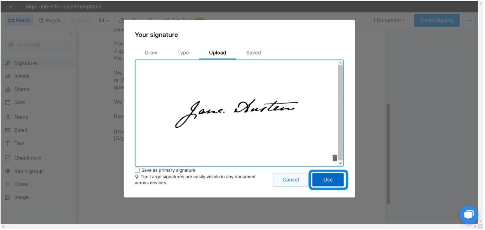 7. Once the PNG file is uploaded, click on **‘Use’** to finalize the signature.