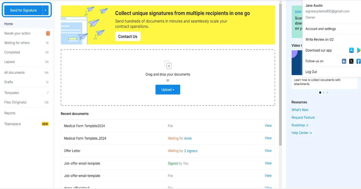 Yes, Google’s eSignature tool is free for users on select Google Workspace plans. For more advanced features or broader document workflows, tools like Signeasy offer a more flexible and powerful eSignature experience.