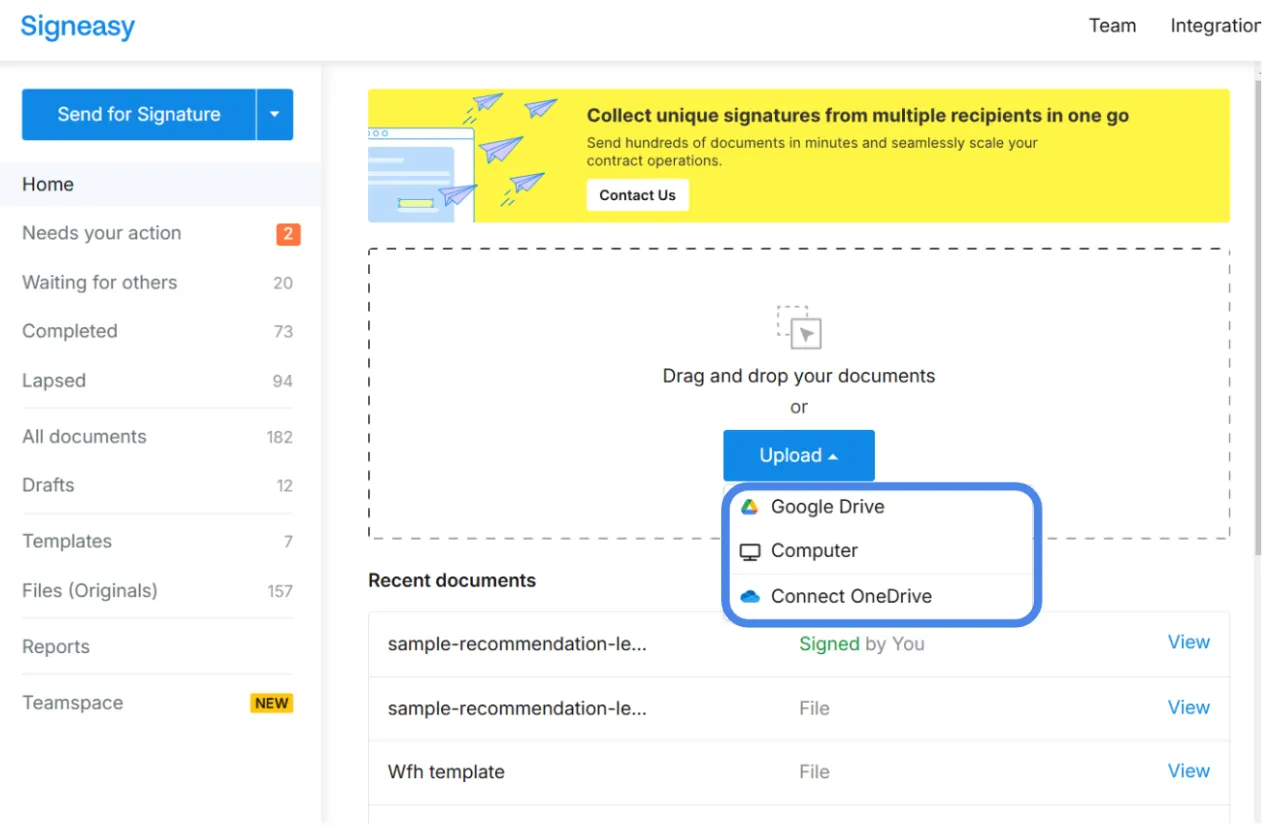2. To sign an excel spreadsheet, first click on "**Upload**".