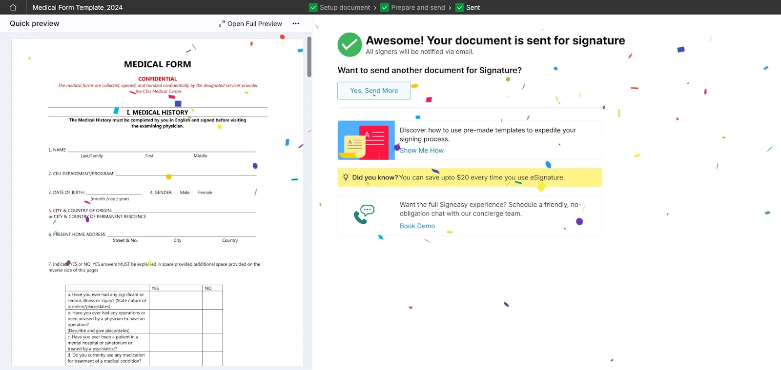 To share a document as a PDF, first save or export it in PDF format from your editing tool. You can then share it via email, cloud storage, or messaging apps. But if you are looking for easier ways to do this, use an eSignature platform like Signeasy to send it securely and track its status.