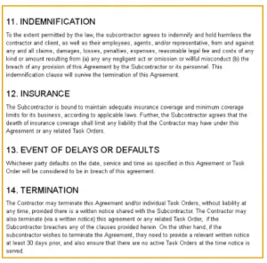 So, in this section, you need to outline who will be responsible for delays and defaults, and which steps either party can take to terminate the contract. Most contractors also add an insurance clause, which makes subcontractors liable to have comprehensive insurance coverage.